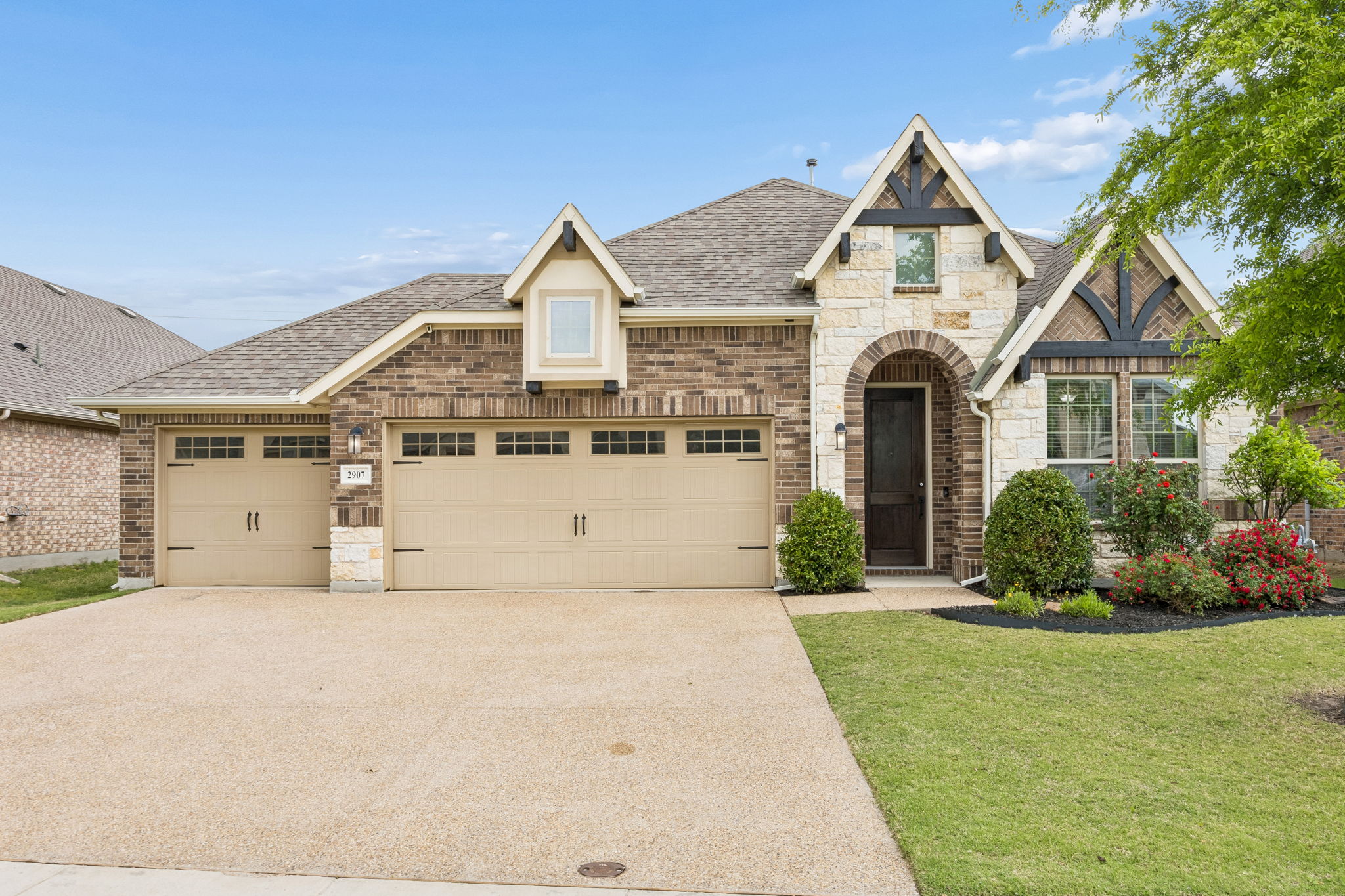 Beautiful one-story home featuring a game room, private study, and 3-car garage! This 3 bedroom, 2.5 bath property offers excellent curb appeal with stone elevation. The open-concept floor plan is light and bright with tall ceilings, creating an inviting space for everyday living and entertaining. The kitchen features stainless steel appliances, gas cooktop, large island, and white cabinetry, flowing seamlessly into the spacious living and dining areas. The living room showcases a stunning stone fireplace as a central focal point. A private office provides the perfect work-from-home space. The oversized primary suite offers plenty of room for a sitting area, and the spa-like bath includes dual vanities, soaking tub, walk-in shower, and large walk-in closet. Two additional bedrooms are split from the primary for added privacy, and the game room provides flexible space for entertainment, media, or play. Additional highlights include a full front and back sprinkler system, covered patio, and large backyard ideal for outdoor enjoyment. Ideally located with an easy walk to the neighborhood park and elementary school. A large city park featuring sports fields, playgrounds, and additional amenities is also currently under development nearby, adding even more future recreational value. Convenient access to Highway 5 and 121 makes commuting simple while maintaining a neighborhood feel.
